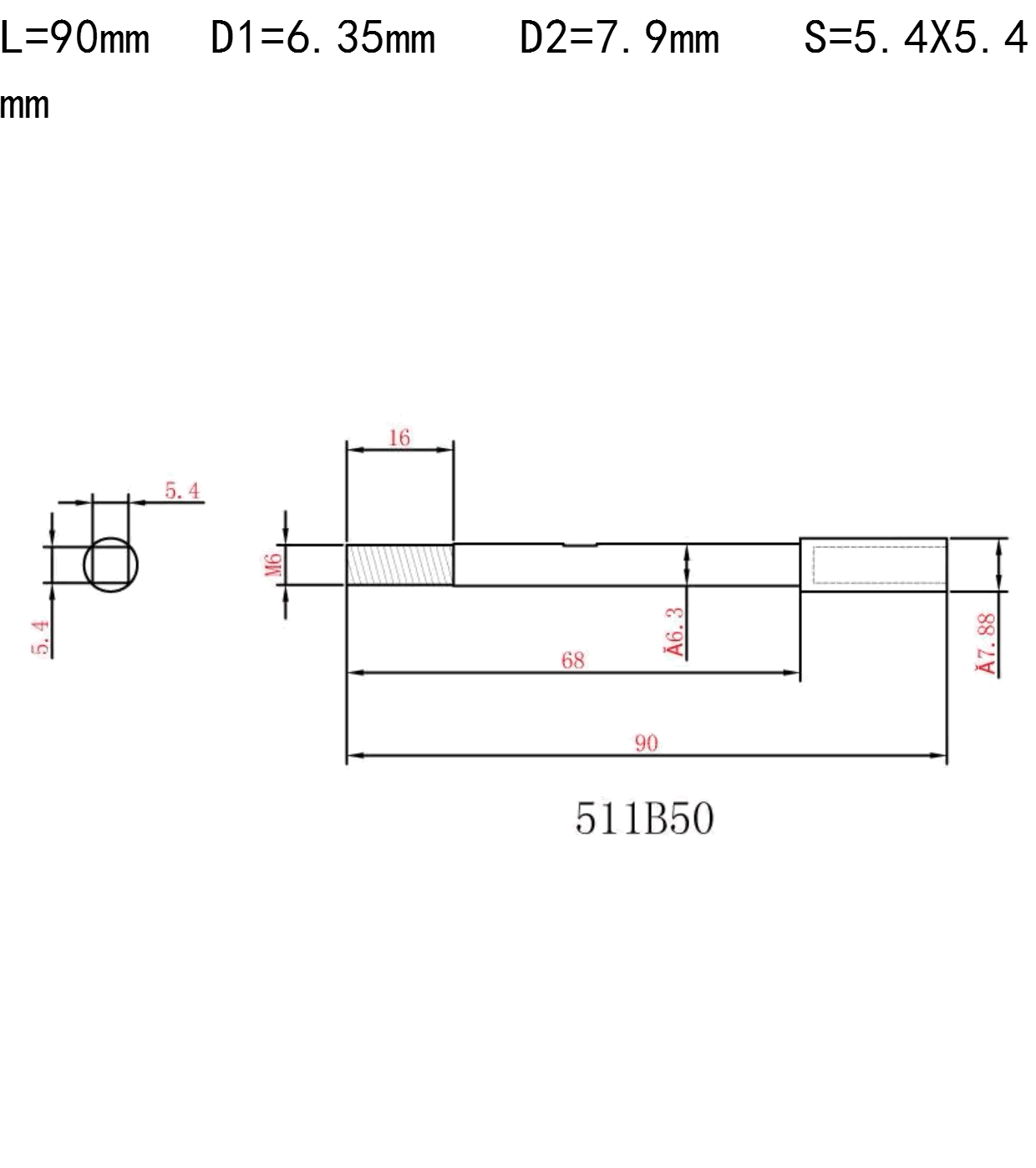 L=90mm D1=6.35mm D2=7.9mm S=5X5mm
